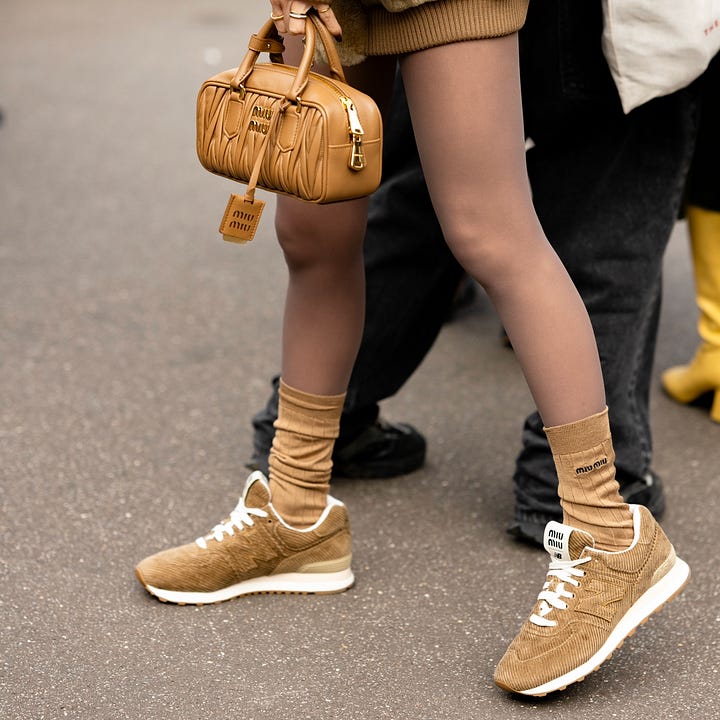 - Miu Miu x New Balance 530 SL Sneaker - I was not expecting these sneakers to claim the top spot - if you had asked me, I would have guessed either the Miu Miu x New Balance 574s or a pair of ballet flats. However, the cinnamon color way of the 530 SL sneaker shown above is completely sold out on Miu Miu so I will be keeping my eyes peeled for the style on the streets. I looked back at my Miu Miu street style photos from the past season and I only captured a pair of 530 SLs secondary to shooting a bag 🙃